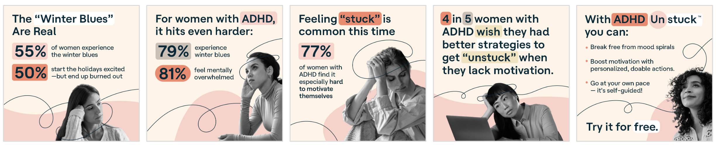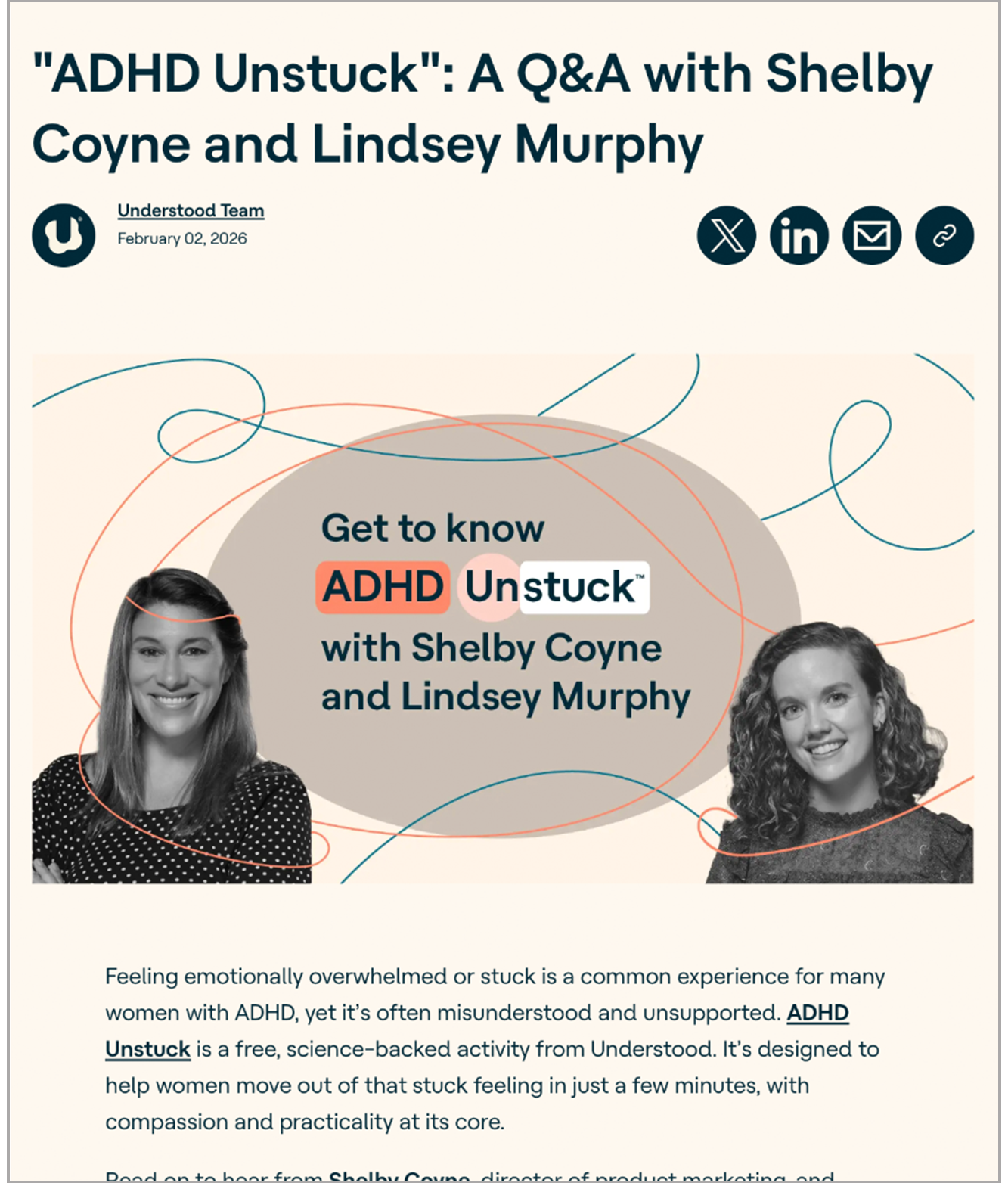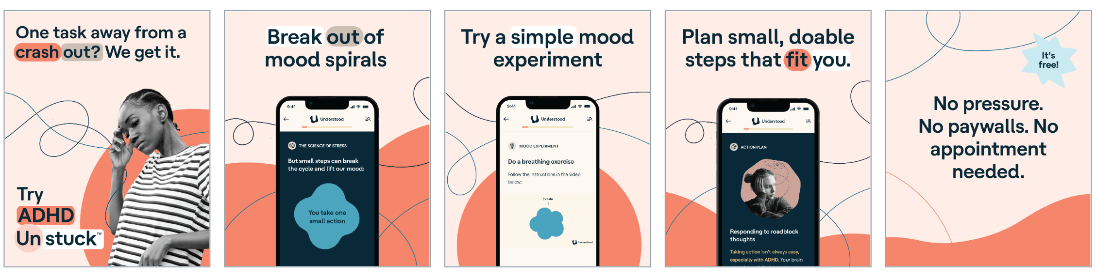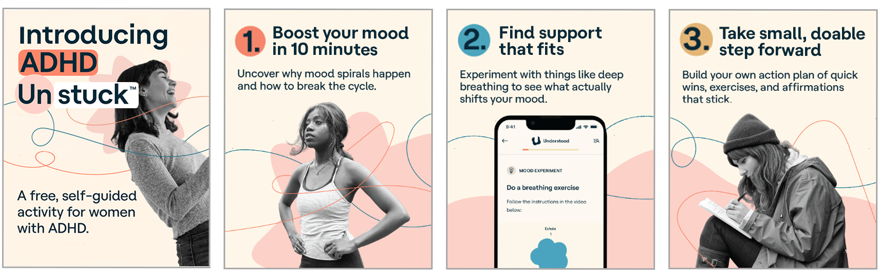 ADHD Unstuck is a self-guided (and completely free) web tool created by Understood.org to help interrupt mood dysregulation in women with ADHD . Its scientifically-backed design effectively guides the user towards simple wins in just under 10 minutes. The launch of the webtool happened mid-January 2026 and the promotional campaign is currently running digitally through Meta, Reddit, and Google.